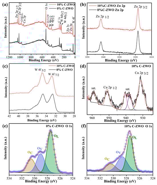 XPS spectra of 0% and 10% C-ZWO samples: (a) survey, (b) Zn 2p, (c) W 4f, (d) Cu 2p, and (e,f) O 1s.