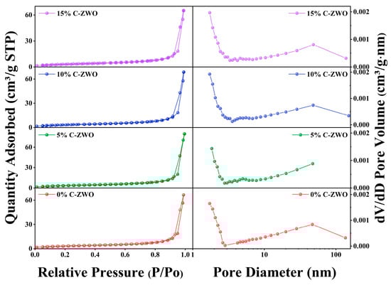 Nitrogen adsorption–desorption isotherms and corresponding BJH pore size distributions of 0%, 5%, 10%, and 15%C-ZWO samples.