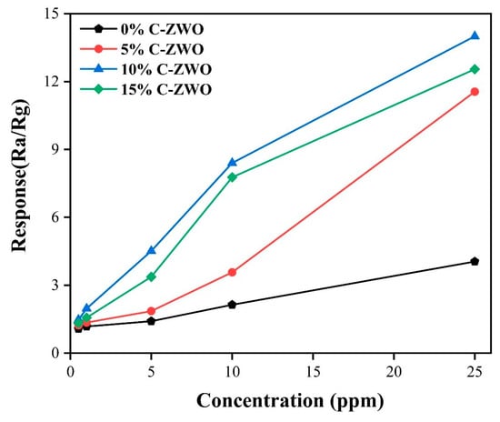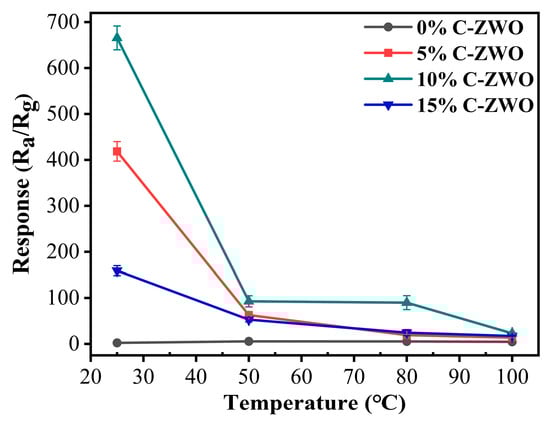 Figure 6 shows the response of the C-ZWO sensors tested at temperatures ranging from 25 °C to 100 °C. The response of the 0% C-ZWO sensor to 25 ppm H2S at 25 °C is 2.1, while the responses of the 5%, 10%, and 15% C-ZWO sensors are 426.9, 651.6, and 161.6, respectively. It is demonstrated that ZnWO4 substantially improves the gas-sensing response of ZnWO4 for H2S after being combined with CuO. The enhancement in the response may be due to the increase in the active sites of the C-ZWO composite materials and the construction of the p-n heterojunction of CuO with ZnWO4. With the increasing CuO contents, the response of the C-ZWO composites increased dramatically, and the response of the material to H2S reached a maximum of 310.3 times that of the pristine ZnWO4 when the molar proportion of CuO was 10%. However, when the molar proportion of CuO was 15%, the response of the C-ZWO composite to H2S became lower, which might be the result of the excess CuO covering the H2S active sites on the surface of the C-ZWO composites. More importantly, H2S can interact with CuO, producing CuS in accordance with the reaction CuO + H2S = H2O + CuS, with the excess consumption of CuO leading to the lower response of the 15% C-ZWO sensor.