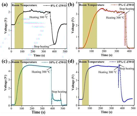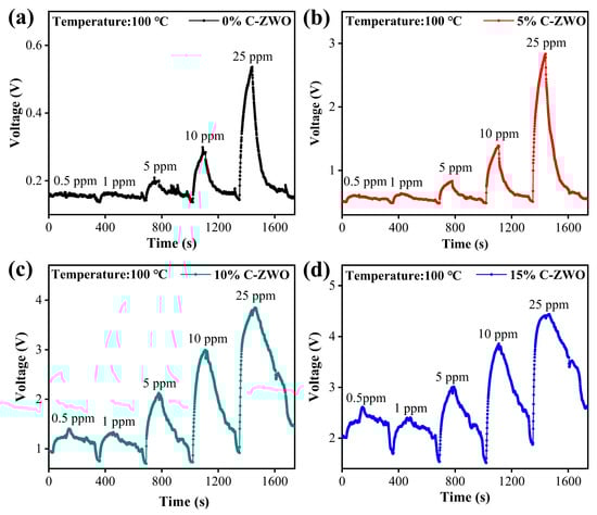 However, most of the sensors at both RT and 100 °C recover slowly (Figure 7 and Figure 8). Notably, at 100 °C, the 0% C-ZWO and 5% C-ZWO sensing recovered 90% in 180 and 138 s (Figure 8a,b), which fulfils the sensor recovery time criteria. The poor recovery of the sensors is mainly due to the low temperature and slow desorption of the gas. To solve the problem of the recoverability of C-ZWO sensors, a method of autonomous recovery and then heating was adopted in the testing process (Figure 7a–d and Figure 8c,d). As shown in Figure 1, the heating voltage (Uh) works as the working heating power supply of the sensing measure system. By adjusting the Uh as 4.58 V, the sensors reached 300 °C and fully recovered in a short period (as indicated by the arrows in Figure 7a–d and Figure 8c,d). We concluded that in the actual application of the process, we applied a 4.58 V short voltage pulse to recover the sensor. The reason for the fluctuation under the voltage/heating pulse may need further study in the future.