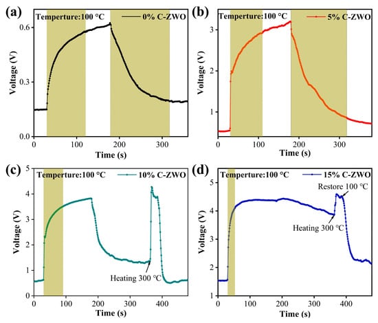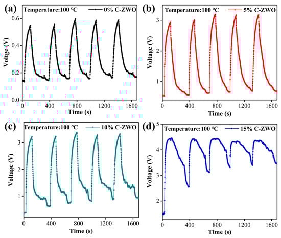 The response curves of (a) 0% C-ZWO, (b) 5% C-ZWO, (c) 10% C-ZWO, and (d) 10% C-ZWO sensors to 25 ppm H2S at 100 °C. By adjusting the Uh to 4.58 V, the sensors reached 300 °C and fully recovered in a short period, as indicated by the arrows in Figures (c,d).
