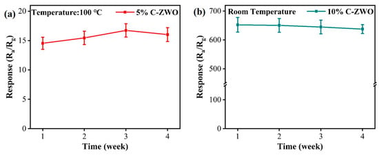 In addition to the short-term multiple response tests, we also tested the sensor performance over four weeks. A set of results was measured every 7 days (Figure 12). After four weeks (at optimum operation temperature), the sensors based on the 5% C-ZWO and 10% C-ZWO samples have good, acceptable long-term stability, which shows good potential for further applications.