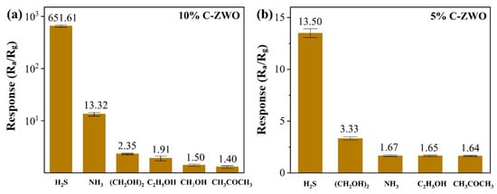 The selectivity of (a) the 10% C-ZWO sensor at RT and (b) the 5% C-ZWO sensors at 100 °C, to 25 ppm H2S gas and 100 ppm other gases.