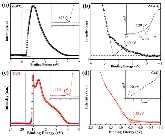 The UPS spectra of ZnWO4 (a,b) and CuO (c,d) (the insets in (b) and (d) are the band gap spectra of ZnWO4 and CuO, respectively).