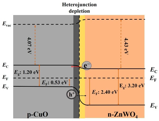 As shown in Figure 15, the electrons in ZnWO4 and holes in CuO flow in opposite directions due to the large inhomogeneous gradient in carrier concentration, leading to the formation of an internal electric field between the ZnWO4 and CuO interface [57]. When two materials are combined, the energy bands of the ZnWO4 and CuO are bent, and the electrons are transferred until the Fermi level reaches equilibrium, and the material directly forms a large depletion region. The formation of the p–n heterojunction hinders the transfer of electrons, leading to a higher electrical resistance of the C-ZWO nanocomposite [57]. That is, before the C-ZWO nanocomposite sample explodes into the H2S gas, the material possesses high resistance (Ra) (Figure S4a).