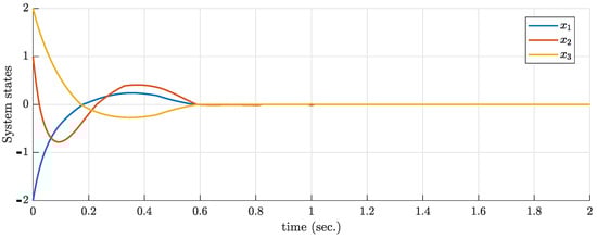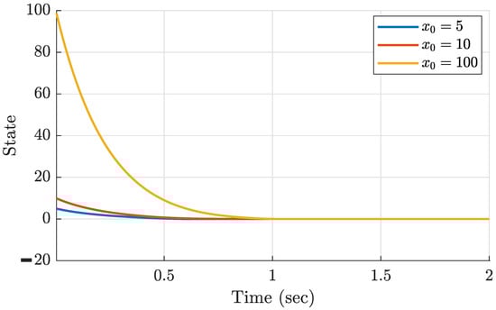 Time evolution of the state for three initial conditions: (blue solid line), (red solid line), and (light orange line). The plot demonstrates the fixed-time convergence property of the proposed control scheme, where all trajectories converge to the origin before the prescribed settling time s, regardless of initial conditions.