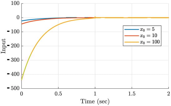 Corresponding control input for the three initial conditions: (blue solid line), (red solid line), and (light orange line). The control signals show the characteristic behavior of fixed-time controllers, with larger initial magnitudes for larger initial conditions, all converging to zero within the prescribed time. Note the absence of chattering, demonstrating the smoothness of the proposed control law.