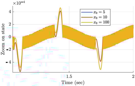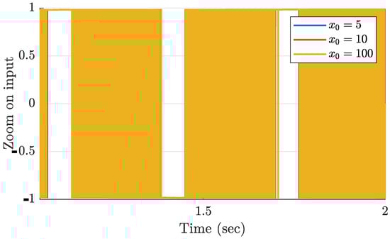 Zoomed-in view of the control inputs near convergence time. The plot reveals the smooth transition to zero input at s, demonstrating the continuity of the control signal. The different convergence rates for different initial conditions are clearly visible in this detailed view.
