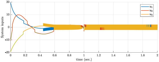 The simulation results are plotted in Figure 5, Figure 6 and Figure 7. The state variables of the PMSM converged before the specified time seconds, as shown in Figure 5. This indicated that the system achieved the desired performance within the predetermined time limit. Additionally, the sliding variables, which were crucial for maintaining system stability and robustness, also converged within the same time frame, as illustrated in Figure 7. This convergence of sliding variables confirmed the effectiveness of the control strategy in achieving the desired performance. The input signals required to drive the system are depicted in Figure 6, showing how they varied over time to meet the performance specifications and ensure that the system operated within the defined constraints.