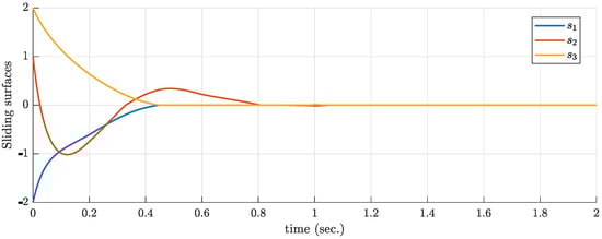 Time response of the sliding variables of controlled PMSM. The settling time was set to s. It was observed that the sliding mode variables converged before 2 s, demonstrating the system’s ability to achieve prescribed-time convergence.