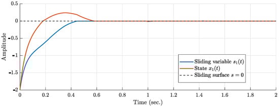 Figure 8 further illustrates the convergence process on the sliding surface. It shows the sliding variable approaching zero, which defined the sliding manifold, and the state converging to the equilibrium point within the prescribed time. This figure strongly supports the theoretical claims about the system’s ability to reach the sliding manifold and the desired equilibrium in the prescribed time interval.