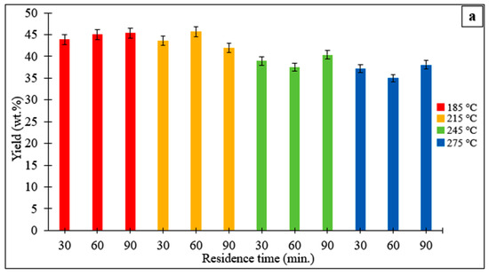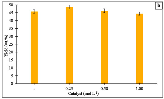 (a) Yields of hydrochars obtained from the hydrothermal processing of the Stevia rebaudiana at different temperatures and reaction times. (b) Yields of hydrochars obtained from the hydrothermal conversion of the Stevia rebaudiana in the presence of a catalyst (acrylic acid) at a temperature of 215 °C and a reaction time of 60 min.