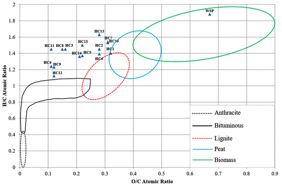 Van Krevelen diagram of the waste Stevia rebaudiana (WS) and hydrochars (HC1–HC15) produced via hydrothermal carbonization using acrylic acid as a catalyst at 185, 215, 245, and 275 °C, under varying reaction times (30, 60, and 90 min) and catalyst.