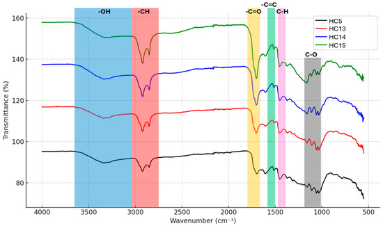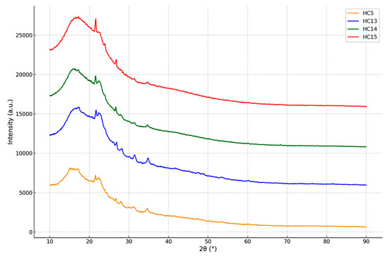XRD, a non-destructive technique for determining the crystalline structure of carbon-based materials, has been widely accepted. To evaluate the structural transformation of biomass derived from the Stevia rebaudiana after hydrothermal carbonization (HTC), XRD patterns of hydrochars synthesized at 215 °C for 60 min with varying concentrations of acrylic acid (AA) were analyzed and are presented in Figure 4. The samples coded as HC5 (without catalyst), HC13 (0.25 mol L−1 AA), HC14 (0.50 mol L−1 AA), and HC15 (1.00 mol L−1 AA) exhibit broad and low-intensity diffraction peaks, particularly around 2θ ≈ 22°. These patterns are characteristic of carbonaceous materials with amorphous structures, rather than well-ordered graphitic crystals [36]. Baysal et al. [37] and Sonilbare et al. [38] have stated that aromatization and carbonization reactions may be the main reasons for the transformation from the crystalline phase to the amorphous phase. In the catalyst-free sample (HC5), the peaks are notably broad and of low intensity, indicating that the carbon structures formed during HTC are largely disordered and lack crystalline phases. As the concentration of acrylic acid increases, the diffraction peaks in the XRD patterns become narrower and more distinct. This is particularly evident in samples HC14 and HC15, where increased peak intensity suggests that acrylic acid promotes partial graphitization and a more organized carbon framework [16,39]. Among the samples, HC15 displays the most developed diffraction pattern with semi-crystalline characteristics and enhanced aromatic structures. This outcome highlights the catalytic role of AA during the HT process and its contribution to improving the structural organization within the carbon matrix. It is well known that organic acids, particularly carboxylic groups, support dehydration and cross-linking mechanisms during carbonization [40]. Nonetheless, the absence of sharp peaks corresponding to crystalline phases in all patterns indicates that the resulting hydrochars are predominantly amorphous or semi-crystalline. Such structures are advantageous for environmental applications (e.g., adsorbent catalyst supports) due to their high surface area, abundance of functional groups, and porosity [41].