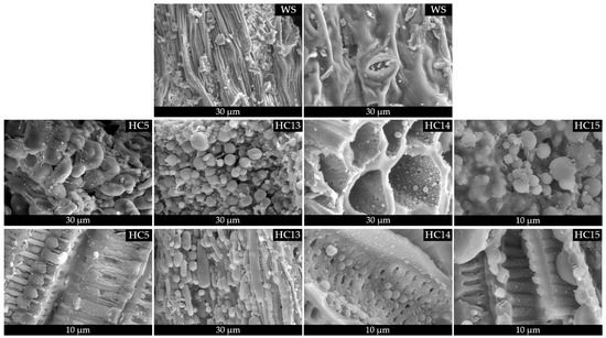 Scanning electron microscopy (SEM) images of raw Stevia rebaudiana biomass and hydrochars produced via hydrothermal carbonization (HTC) at 215 °C for 60 min with different concentrations of acrylic acid (AA) are shown in Figure 5. These images offer valuable insights into the surface morphology and structural changes of the biomass under various catalytic conditions. The untreated biomass (WS) displays a well-preserved fibrous structure, characterized by elongated, compact vascular bundles and a porous cellular matrix typical of lignocellulosic materials. After HTC treatment without a catalyst (HC5), significant morphological degradation occurs. The original fibrous architecture collapses, resulting in irregular, fused aggregates with little structural order, indicative of thermal decomposition and carbon matrix shrinkage caused by dehydration and devolatilization reactions [42]. With the addition of acrylic acid as a catalytic agent, significant morphological transformations are observed. In HC13 (0.25 mol L−1 AA), uniformly distributed microspheres appear across the surface, likely formed through localized nucleation during carbonization. These spherical structures become more prominent in HC14 (0.50 mol L−1 AA), where a hierarchically porous network embedded with well-defined carbon spheres is evident. This progression indicates that moderate concentrations of AA promote dehydration, crosslinking, and aromatization reactions, resulting in a more organized and porous carbon framework [43,44]. At the highest concentration (HC15, 1.00 mol L−1 AA), the surface morphology is densely populated with aggregated spherical particles, forming a continuous carbon matrix with reduced macroporosity. The increase in particle size and compaction corresponds to enhanced carbon ordering, which has previously been linked to the catalytic effects of carboxylic acids in promoting condensation and cyclization reactions during HTC. Additionally, the observed surface roughness and particle cohesion suggest the formation of a denser carbonaceous phase, which may affect the hydrochar’s physicochemical properties, such as the surface area, conductivity, and adsorption performance. The progressive morphological refinement observed with increasing AA concentration confirms the catalytic role of organic acids, not only in tuning chemical structure but also in directing particle morphology during HTC. These spherical carbon architectures have been reported to enhance performance in environmental applications, such as adsorption, capacitive energy storage, and catalyst support systems, owing to their tunable surface functionality and structural stability [45,46].