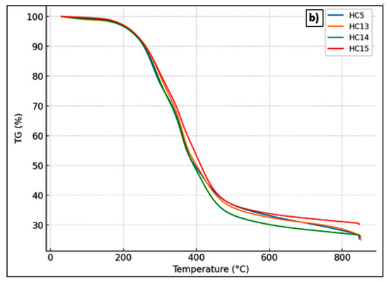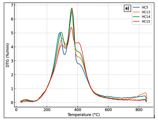The thermal behavior of hydrochars derived from Stevia rebaudiana was examined using thermogravimetric analysis (TGA) and derivative thermogravimetric analysis (DTG) to assess the impact of varying acrylic acid (AA) concentrations after hydrothermal carbonization (HTC) at 215 °C for 60 min. The TGA and DTG curves for the samples labeled HC5 (no catalyst), HC13 (0.25 mol L−1 AA), HC14 (0.50 mol L−1 AA), and HC15 (1.00 mol L−1 AA) are shown in Figure 6. The active decomposition region lies between 200 and 500 °C, during which the weak bonds within the polymeric structures of lignocellulosic biomass components—namely hemicellulose, cellulose, and lignin—undergo thermal cleavage [48]. As expected, moisture loss occurred between 25 and 100 °C. The second thermal degradation stage took place around 275 °C, with a shoulder appearing in all samples—more pronounced in the DT sample [49]. The second stage (~200–400 °C) is attributed to the degradation of hemicellulose and volatile components, and the third stage (~400–600 °C) reflects the decomposition of condensed aromatic structures [50,51,52,53]. The primary decomposition of cellulose occurs at approximately 350 °C, where a distinct peak indicating the maximum degradation rate is observed [49]. HC13 and HC14 exhibited greater mass losses, while HC15 showed the least degradation and the highest residual carbon content. DTG curves indicated that HC15 experienced a delayed and less intense decomposition rate, suggesting enhanced thermal stability. These results confirm that higher concentrations of acrylic acid promote the formation of more condensed and thermally robust carbon structures, supporting its catalytic role during HTC.