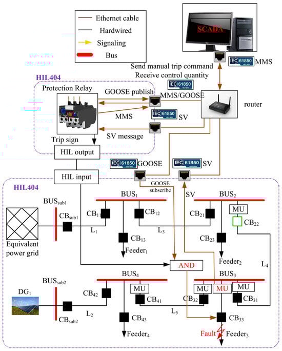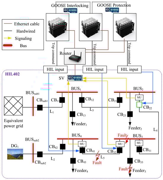 The schematic diagram of the experimental setup for this scenario is shown in Figure 3. The equivalent power grid serves as the power supply source. CBsub1 and CBsub2 are the substation outlet circuit breakers, and BUSsub1 and BUSsub2 are the substation outlet busbars. BUS1, BUS2, BUS3, and BUS4 are the convergence busbars of the transmission network, respectively. CB11, CB12, CB21, CB31, CB32, CB41, and CB42 are the convergence busbar outgoing circuit breakers, CB22 is the interconnection circuit breaker, CB13, CB23, CB33, and CB43 are load feeder circuit breakers, L1–L5 are segmented lines, and Feeder1-Feeder4 are load feeders. The circuit breaker receives the corresponding IED trip command and status from the HIL device input terminal through a hard-wired cable, and the IED receives the MU measurement signal implemented from the microgrid through the Ethernet port.