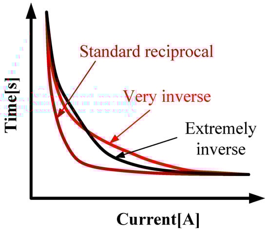 For each implemented protection mechanism, there are separate settings that can be set from the SCADA control panel that simulates the IED. Taking the overload protection (ANSI 49) as an example, there are three I-t characteristic curves in the SCADA panel for selection, as shown in Figure 5, and the relay logic unit calculates the time delay according to the selected curve of the given threshold current. The established communication layer comprises station control, bay, and process levels, as shown in Figure 6. The station control layer’s MMS server sends trip commands to simulated bay-level IEDs via the station bus, which then transmits GOOSE messages to circuit breakers through the process bus to complete operations.