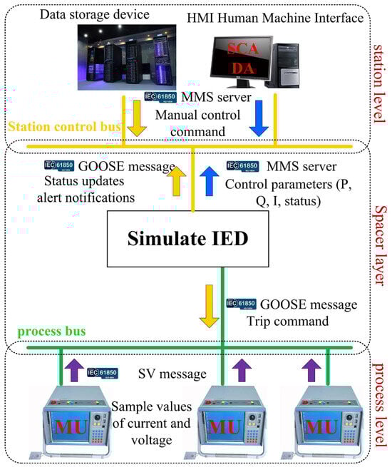 With the large-scale application of different components such as controllers, sensors, and actuators in smart grids, the management of modern smart grids has become more complex [1,2,3]. Using intelligent electrical equipment (IED) to perform protection and control operation is one of the key points to realize the accurate and efficient operation of these components. Because the IED uses IEC 61850 as the standard communication protocol, it ensures the interoperability between substation equipment from different manufacturers [4,5,6]. On the other hand, the network security of a substation based on an IEC 61850 communication protocol is indisputable [7,8,9,10]. IEC 61850 protocol open architecture also introduces new risks such as false data injection and denial of service attack [11,12,13,14]. In order to meet the requirements of the scenario, complete tests will be carried out before implementation. However, due to the need for real-time monitoring and a control system to make appropriate decisions, there are often problems when these tests are carried out directly on the power grid. Therefore, the pre-operation test of the network physical system (CPS) composed of multiple communication layers has become an urgent challenge for the current smart grid.