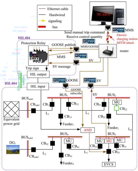 To evaluate network security vulnerabilities, network attack simulations were performed on the experimental platform based on the architecture depicted in Figure 7. The platform incorporates multiple protective mechanisms and features a low-voltage EVCS operating at 400 V [39]. There are two types of man-in-the-middle attack: data interception and data tampering, which can cause the system to refuse to move and mismove, respectively. Data interception is defined as the attacker intercepts the data packets sent by the master station and the sub-station, replaces the corresponding bytes of the command data packet with the contents of the timing data packet in the buffer and sends it to the sub-station, and returns the sub-station response data packet to the master station. In this attack mode, the sub-station cannot receive the control command from the master station, but the master station mistakenly believes that the sub-station has received the command and acted, resulting in the sub-station refusing to move. Data tampering is defined as being when an attacker detects a command packet, he starts to attack, replacing all data packets sent by the master station with command packets, and the command content is randomly set to load shedding or load switching, resulting in fail operation of the sub-station. Although the goal of network attackers when attacking the power grid is to maximize the damage to the power grid itself, due to the influence of the monitoring level of the power grid itself, when the power grid state deviates from the normal state too much, the adjacent monitoring unit in the system can easily monitor the power grid fault.