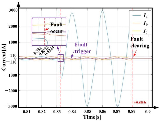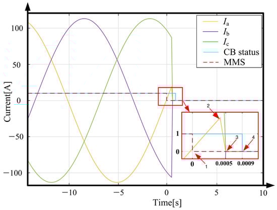 The current data gathered by the measuring unit in conjunction with IED41 during the fault period is illustrated in Figure 8. The fault initiated at 0.8322 s within the observation window and cleared at 0.8795 s, marking a 47.3 ms duration from fault onset to circuit breaker operation. The total fault clearance delay comprises several stages: the delay caused by the digital to analog converter of 0.12 ms, the delay of the communication network protocol when packaging and unpacking data of 4.35 ms, the processing time of IED detection fault of 1.83 ms, and the delay of the real-time simulator of 40.8 ms. The IED’s fault detection processing time can be configured according to the priority of different fault types. The buffer is optimized by queuing theory, and the scheduling algorithm is fixed priority. The real-time simulator delay refers to the time needed to drive the circuit breaker to complete its action after receiving the trip command via GOOSE messaging.