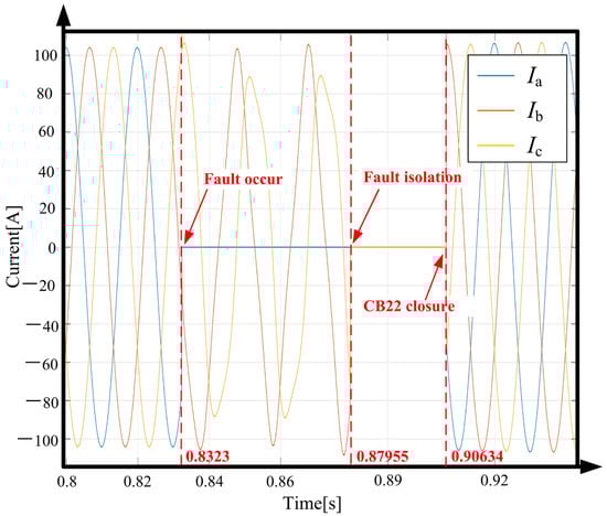 The current measurement readings for Load 3 connected to Busbar 3 are presented in Figure 9. The fault occurred at 0.8323 s, triggering the disconnection of circuit breaker (CB) 41. The faulty line was isolated by opening CB32 at 0.87955 s. IED22 issued a GOOSE closing command at 0.90634 s, causing CB22 to close and restore power supply to Load 2. Consequently, the power interruption duration for Load 3 was approximately 74.04 milliseconds. There is a 12.7-millisecond delay between an IED’s tripping action and the transmission of the GOOSE message to update the status of other IEDs’ circuit breakers. While communication delays for other IEDs can be analyzed separately, their values are generally comparable.