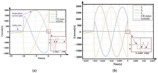 Introduce unbalanced current surges and overload conditions into Load 3, then capture the response by simulating the IED protection functionality. As anticipated, GOOSE messages transmitted by IEDs were promptly received by subscribers with no noticeable delays. The simulation results are presented in Figure 11. Figure 11a displays the outcomes under unbalanced current fault conditions, where the simulated IED accurately analyzes electrical data collected by the MU and issues a circuit breaker tripping command when current thresholds are exceeded. Figure 11b illustrates the results under overload fault conditions, where the simulated IED compares the measured current against overload protection settings and sends a trip signal via the GOOSE transmitter. The time delay between fault occurrence (for both unbalanced current and overload faults) and the corresponding change in the MMS server’s circuit breaker (CB) state aligns precisely with the calculated results from the physical IED in scenario 1. Therefore, modifying the setpoint configuration on the SCADA control panel for simulated IEDs will lead to corresponding action delays based on the implemented protection strategies.