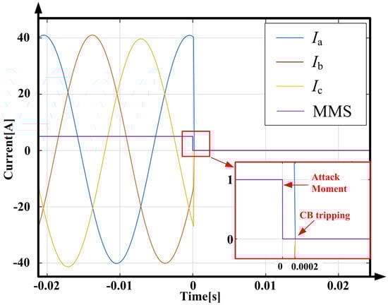 MITM attacks enable adversaries to intercept and potentially manipulate information exchanged within communication channels without authorization. The precise moment of the attack, captured by the merging unit (MU) deployed in the microgrid, is depicted in Figure 12. After executing the MITM attack algorithm, the simulated IED issued a circuit breaker tripping command, prompting CB33 to isolate the electric vehicle charging station (EVCS) fault. However, the monitoring unit continued to receive normal measurement data, including current and voltage readings, suggesting no operational abnormalities. The EVCS remained properly connected to the power grid, and no circuit breaker tripping events were triggered. In multiple electric vehicle charging stations (EVCSs) or other distributed energy resource (DER) endpoint systems, man-in-the-middle attacks, by invading firmware or software vulnerabilities (such as unencrypted update endpoints and weak identity authentication) of the EVCS management system (ECVSMS), batch implanting malicious code, and building multiple EVCS nodes into botnets. Scan the exposed ECVSMS portal through Shodan and other tools and use default credentials or SQL injection vulnerabilities to spread horizontally [43].