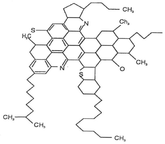 Asphaltene was first identified in 1837 by J.B Boussingault who defined it as a residue of the distillation of bitumen, soluble in turpentine but insoluble in alcohol [11]. Asphaltenes are poly-aromatic hydrocarbons composed of fused rings of aromatic molecules such as benzene and, in many cases, attached to heteroatoms such as nitrogen, sulfur, nickel, oxygen, and vanadium [12], as depicted in Figure 1. The density of asphaltene is within the range of 1.16 to 1.25 g/cm3 [13].