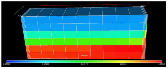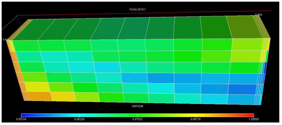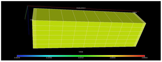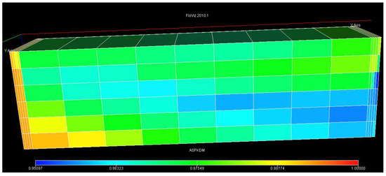 The permeability in the X, Y, and Z directions is 400, 400, and 250 mD, respectively. The average reservoir porosity is 0.15. The initial oil saturation in the reservoir is 0.77. The reservoir temperature is 150 °F, and the formation temperature remains almost constant during the production life of the reservoir. The geothermal gradient effect causes the fluid that flows through the vertical well to the surface to cool [25]. Surface equipment plugging may result from asphaltene precipitation in the well, but this is outside the purview of this investigation.