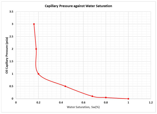 The oil water relative permeability curves are shown in Figure 4. It should be noted that Figure 4 and Figure 5 represent baseline oil characterization data. From Figure 4, the oil–water relative permeability curve intersects at a water saturation of 0.54. The reservoir can thus be described as water-wet. From Figure 5, the residual oil saturation and irreducible water saturation was calibrated to capture the behavior of asphaltenic crude systems under CO2 flooding.
