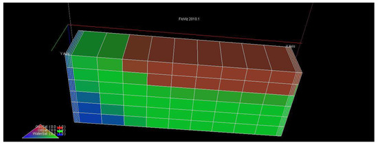 The physical properties of the reservoir used in this simulation included an average porosity of 0.18 and a horizontal permeability of 80 mD. The rock was assumed to be homogeneous and isotropic for modeling purposes. Elastic modulus was not included as geomechanical effects were not modeled in Eclipse. Figure 2 depicts the grid block size distribution of the reservoir, with Figure 3 showing the reservoir model with a color gradient legend.