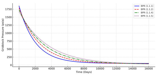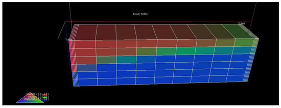 The dimensions of the reservoir used in this study are 4740 ft., 1000 ft., and 30 ft. for the length, width, and thickness, respectively. The top of the reservoir is located at a depth of 4000 ft. The formation gas–oil contact is at a depth of 2000 ft. Oil–water contact is located at a depth of 4050 ft. The reservoir is divided into 17 × 1 × 6 grid blocks along the X, Y, and Z axes, respectively. The first and last four blocks are shortened to 30 feet in length, while intermediate blocks are set to 500 feet. The selected mesh resolution represents a balance between computational efficiency and numerical stability, particularly under compositional flow and phase behavior modeling. This configuration ensured stable convergence without excessive simulation time. In order to handle pressure discontinuities from open wells and maintain grid block pressures close to wellbore pressure, the simulator uses average block pressure.
