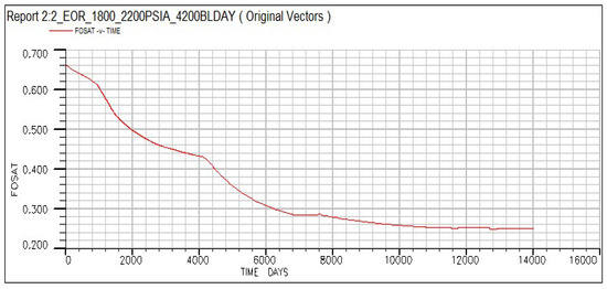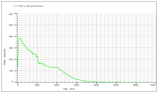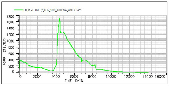 The reservoir produced naturally without fluid injections until the production rate declined to its economic limit on day 4000 on the simulation scale, as shown in Figure 9. This stage represents the primary recovery.