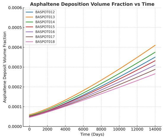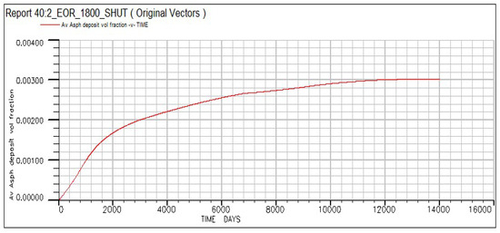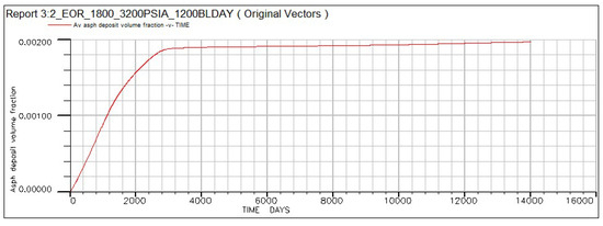 Average asphaltene deposit volume fraction at 3200 psia and 4200 bbl/day vs. time.