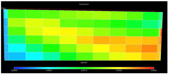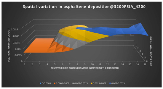 Figure 31 shows a spatial variant in asphaltene deposition at an injection pressure of 3200 psia and an injection rate of 4200 bbl/day. The colour scale at the bottom quantifies asphaltene deposition fractions. Relatively low deposition is observed at the formation near the injector due to high pressure and shear force, which are generated by the fluid injection. The deposition increases with distance from the injector. The changes in the deposition in the vertical direction in the formation around the middle of the reservoir are due to the phase saturation gradient, which is caused by the gravitational segregation effects. The oil saturation is maximum at the middle formation in the vertical direction. The V-shaped surface illustrates the tendency for the occurrence of deposition in the middle formation at relatively high shear force.