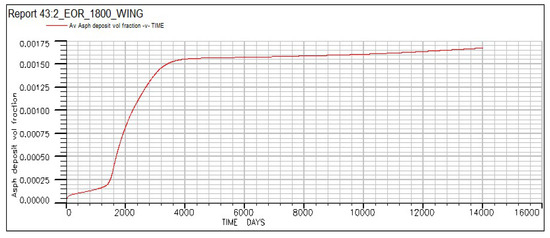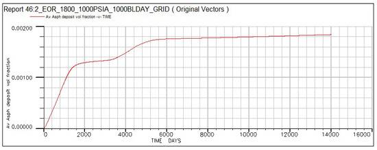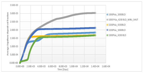 Average asphaltene deposition volume fraction at injection pressure of 1000 psia and flow rate of 1000 bbl/day.
