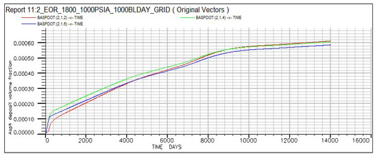 The initial sharp rise observed in Figure 9 represents the early-stage high productivity typical of CO2 miscible displacement, where mobility ratio improvements lead to the efficient displacement of oil in the swept zones. By contrast, the delayed surge after 4000 days in Figure 10 corresponds to the breakthrough of CO2 into previously unswept or low-permeability zones, causing a renewed increase in recovery. This late-stage production acceleration is consistent with reservoir heterogeneity and delayed asphaltene re-dissolution effects.