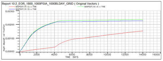 The MMP was computed as 2079.2 psia. It is important to investigate the details associated with the mechanism of asphaltene-induced formation damage under both immiscible and miscible conditions. The average asphaltene deposition volume fraction at an injection pressure of 1000 psia and a flow rate of 1000 bbl/day is depicted in Figure 20.