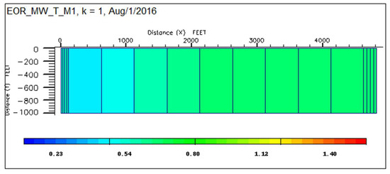 As illustrated in Figure 6, gravitational segregation caused the injected CO2, which is less dense than water and oil, to flow through the upper reservoir layers while water occupied the lower layers and oil concentrated in the center.