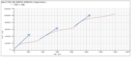 After further adjustment in injection methods, oil recovery was improved, as shown in Figure 32. The blue arrowed line reveals that the slope of oil production total increased with adjustment on injection techniques.
