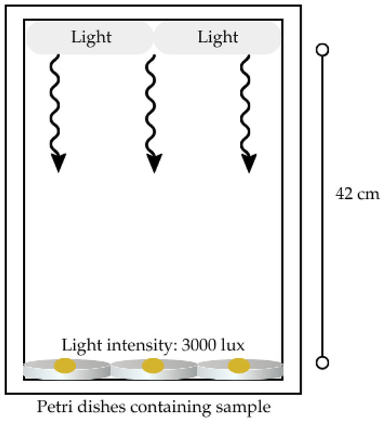 For samples receiving no light, they were similarly placed in a glass petri dish and gently flattened into a homogenous layer. These samples were placed in a drawer near the samples receiving light, and their location also received 0 lux. After 7 days, samples were rotated every 3.5 days to achieve uniform light exposure. Around 0.1 g of samples were collected from each petri dish for measurements on days 0, 7, 14, 21, and 30. A schematic detailing the design and key characteristics of the light box used for the experiments was created and included below (Figure 1).