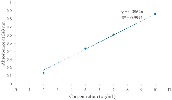 Following methods from our previous publications [25,26], we determined the zeta potential and particle size of freshly redispersed nanoemulsion samples. First, the freeze-dried nanoemulsion was dissolved in water and further diluted 100× using water. Approximately 1 mL of sample was then aliquoted into a folded capillary zeta cell. Particle size and zeta potential were measured immediately after dilution using the Zetasizer Nano ZS (Malvern Instruments Ltd., Worcestershire, UK). Further, the essential oil recovery percentage of redispersed nanoemulsion was determined. First, the peak of LGEO was found by measuring the oil at a range of 200–800 nm on a UV–Vis spectrophotometer (Azzota Scientific, Claymont, DE, USA). To measure the essential oil recovery, a standard curve of LGEO was created using a UV–vis spectrophotometer at 243 nm, the wavelength at which the LGEO peaked. The standard curve was made using pure LGEO and 95% ethanol as a diluent at different concentrations, including 2, 5, 7, and 10 µg/mL. To quantify the essential oil recovery after freeze-drying, the redispersed nanoemulsion was diluted to a detectable value on the spectrophotometer, and the absorbance at 243 nm was recorded. Lastly, the standard curve and measured absorbances of samples were used to calculate the concentration.