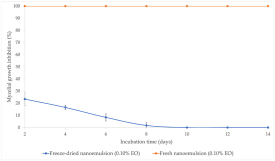 To determine the effect of freeze-drying on the antifungal activity of the nanoemulsion, mycelium growth inhibition experiments were conducted. Fresh nanoemulsion with 0.1% EO in media was able to completely inhibit mycelium growth over a 14-day period. In contrast, redispersed freeze-dried nanoemulsion at 0.10% EO in media showed an initial 77% loss in antifungal activity after only two days. At day 10, no more antifungal activity was observed (Figure 3). Additionally, images confirming the antifungal activity results are displayed in Supplementary Figure S1.