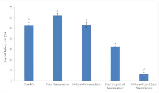 To test the antioxidant activity or free radical scavenging behavior of LGEO, nanoemulsion, and freeze-dried nanoemulsion, the DPPH assay was utilized. Essential oils, specifically LGEO, contain phenolic compounds known to have antioxidant activity [39,40]. On the day samples were created, 5% pure EO exhibited about 53% antioxidant activity, which was 9% lower than the 62% activity measured from fresh nanoemulsion samples made and tested on the same day (Figure 4). Both pure LGEO and fresh nanoemulsion had much higher activity than freshly redispersed nanoemulsion, which had about 33% antioxidant activity.