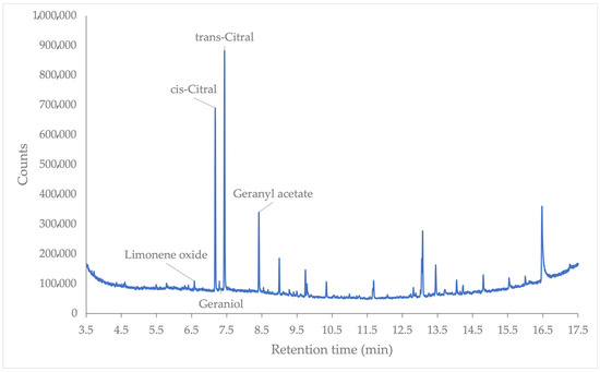 The peak at 16.5 min showed a relative percentage of 16.47%, followed by geranyl acetate at around 7.70% and multiple other molecules with relative percentages close to 3.00% (Table 3). Outside of citral, geraniol, and geranyl acetate, all peaks mentioned were not confirmed by use of a standard; rather, the peaks were identified using the Agilent Masshunter software and NIST library. Generally, the highest probability molecule was selected, and similar results in the literature were searched for. Outside of the molecules discussed already, there were others detected that are reported in Table 3. To our knowledge, every molecule in the table after caryophyllene oxide has not been reported in lemongrass essential oil studies in the literature. Many of them have been reported in other plant extract studies, while others have not been mentioned or noticed at all. Additionally, because standards were not purchased and tested for these molecules, we cannot confirm their existence in our tested samples. To aid in the confirmation of some of these molecules in our sample as either natural or degradation products, we researched the literature. To summarize the literature search for the source of these molecules, we created a table displaying this information in the Supplementary Materials Table S1.