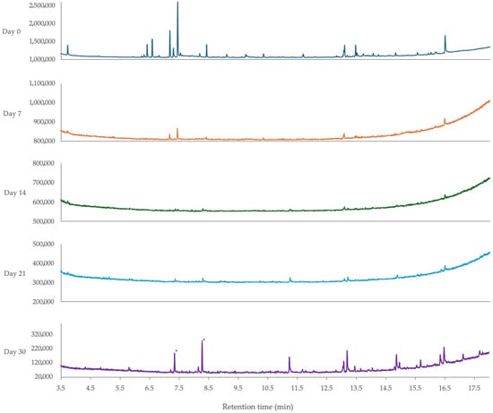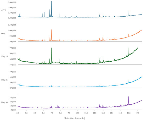 After light exposure, the loss of distinct peaks occurred more rapidly. The peaks that were not completely extinguished by day 7 are located at retention times of 7.17, 7.43, 13.05, 13.08, and 16.48 min. The peaks at 7.17 and 7.43 min correspond to cis and trans-citral, respectively. Although both citral compounds were present after 7 days of exposure, they were no longer detected in samples beyond that point. In contrast, the peaks at 13.05, 13.08, and 16.48 min were detected throughout the entire 30-day period, with an increase in concentration observed from day 21 to day 30.