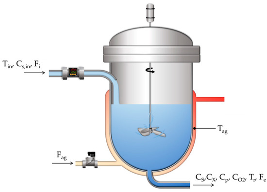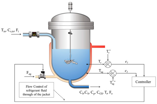 The yeast Saccharomyces cerevisiae is typically used for ethanol production in bioreactors, as it is easy to handle and its biomass can be reused [6,7]. In the fermentation process, the temperature of the bioreactor is a crucial factor, as it influences the fermentation and the denaturation process of microorganisms’ proteins [3,8]. In addition to temperature, pressure, pH, and dissolved oxygen concentration influence the growth of microorganisms during fermentation. To optimize the process, controlling these variables is a relevant alternative, considering that the growth rate of microorganisms directly impacts the quality and quantity of ethanol [9].