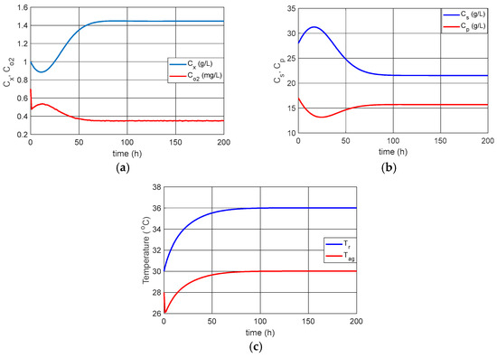 Open-loop system. (a) Output concentrations of the biomass (Cx) and the oxygen . (b) Output concentrations of the glucose (CS) and the ethanol (CP). (c) Output temperature of the reactor (Tr) and the jacket (Tag).
