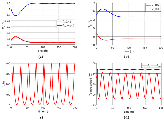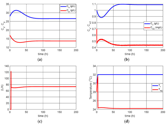 System with control of the coolant flow rate (Fag). (a) Output concentrations of the biomass (Cx) and oxygen (). (b) Output concentrations of the glucose (CS) and ethanol (CP). (c) Coolant flow rate Fag. (d) Output temperatures of the reactor (Tr) and the jacket (Tag).